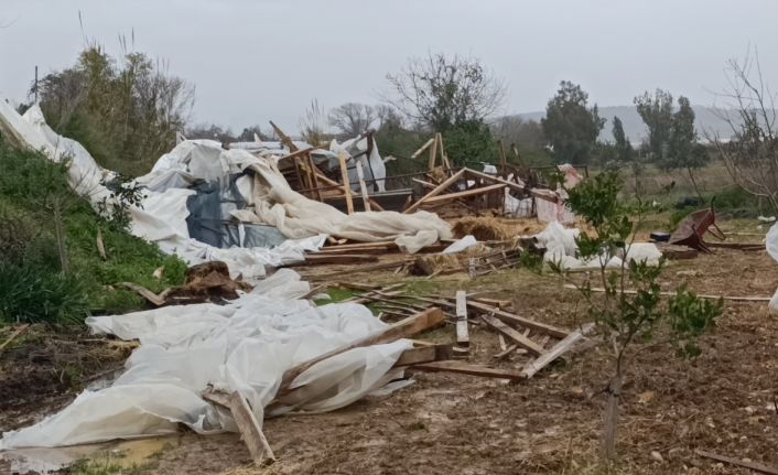 Denizyaka Mahallesi girişinde ise çilek seraları zarar görürken, gündüz toplanarak pazara götürülmeyi bekleyen çilek yüklü römork hortumla birlikte ters döndü.
