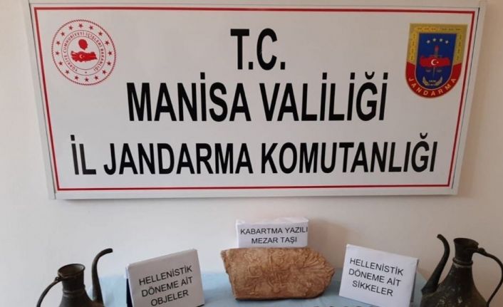 Manisa’nın Saruhanlı ilçesinde jandarma ekipleri tarafından elde edilen istihbarat neticesinde bir evde yapılan aramada Helenistik döneme ait olduğu düşünülen, sikke, mezar taşı, ibrikler ve 7 farklı obje ele geçirildi.