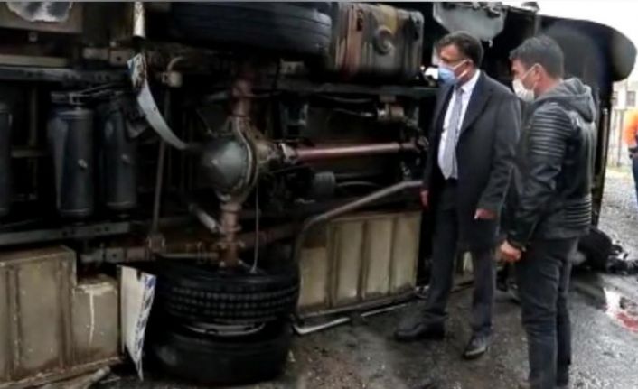 Manisa’nın Alaşehir ilçesinde seyir halindeyken lastiği patlayan işçi servisinin yola devrilmesi sonrası minibüs alev aldı. 20 kişinin bulunduğu işçi servisinde 7 kişi yaralandı.