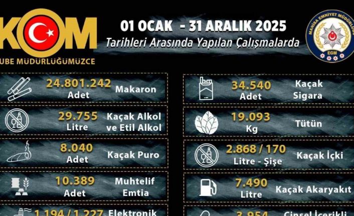 Manisa İl Emniyet Müdürlüğü Kaçakçılık ve Organize Suçlarla Mücadele (KOM) Şube Müdürlüğü ekiplerince 2025 yılı boyunca düzenlenen operasyonlarda 721 şüpheli hakkında işlem yapılırken, 32 kişi tutuklandı. Operasyonlarda 25 milyona yakın kaçak makaron ve tonlarca etil alkol ele geçirilmesi dikkat çekti.