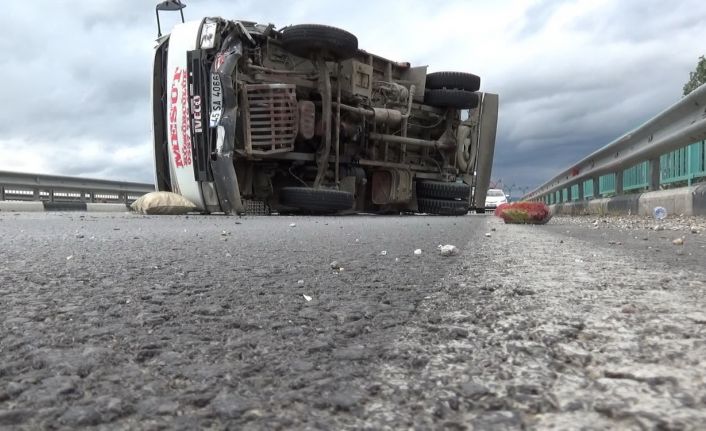 Manisa’nın Salihli ilçesinde köprü üzerinde bariyerlere çarparak devrilen kamyonette bulunan 3 kişi yaralandı.
