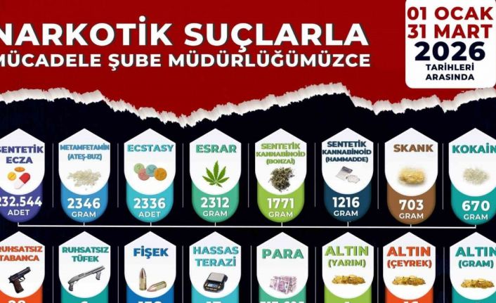 Aramalarda 232 bin 544 adet sentetik ecza hap, 2312 gram esrar, 2346 gram metamfetamin, 1216 gram sentetik kannabinoid hammaddesi, 1771 gram bonzai, 703 gram skunk, 670 gram kokain, 2 bin 336 adet extacy ele geçirildi. Ayrıca 28 ruhsatsız tabanca, 6 ruhsatsız tüfek, 138 fişek, 17 hassas terazi ile uyuşturucudan elde edildiği değerlendirilen 317 bin 695 TL, 16 çeyrek altın, 1 yarım altın ve 1 gram altına da el konuldu.