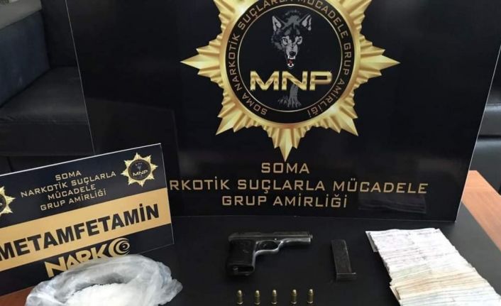 Uyuşturucu veya uyarıcı madde ticareti yapan, nakleden ve kullanan şahıslara yönelik yapılan çalışmalar kapsamında Soma ilçesinde durdurulan bir araçta, şahsın ikametinde ve iş yerinde yapılan aramada; 55,63 gram Metamfetamin maddesi, 42 adet Sentetik Ecza, 8 gram Esrar maddesi, 6 kök Hint Keneviri bitkisi, 4 adet Ecstasy hap, 1 adet Hassas Terazi, 2 adet uyuşturucu madde kullanmaya yarayan aparat, 1 adet ruhsatsız tabanca, 4 adet şarjör ve 5 adet fişek, 129 adet cinsel içerikli ürün ve 12 bin 455 TL uyuşturucu madde ticaretinden elde edildiği değerlendirilen para ele geçirildi.