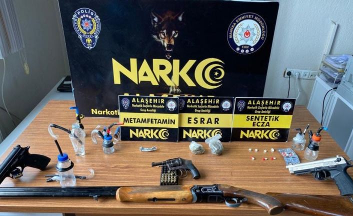Manisa İl Emniyet Müdürlüğü Narkotik Suçlarla Mücadele Şube Müdürlüğü ve Alaşehir Narkotik Suçlarla Mücadele Grup Amirliği görevlilerince uyuşturucu veya uyarıcı madde ticareti yapan, nakleden ve kullanan şahıslara yönelik yapılan çalışmalarda Alaşehir ilçesinde 8 ikamet adresinde aramalar yapıldı. Yapılan aramalarda; 16,70 gram esrar maddesi, 2,13 gram metamfetamin maddesi, 6 adet sentetik ecza hapı, 3 adet extacy hap, 8 adet uyuşturucu madde kullanmaya yarayan aparat, 3 adet ruhsatsız tabanca, 1 adet ruhsatsız av tüfeği, 19 adet 9 mm fişek ve 3 adet 7.65 mm fişek ele geçirildi. Yapılan çalışma sonunda 9 şüpheli şahıs yakalanarak gözaltına alındı. Gözaltına alınan şüphelilerin emniyetteki işlemlerinin devam ettiği öğrenildi.