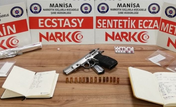 Manisa Emniyet Müdürlüğü Narkotik Suçlarla Mücadele Şube Müdürlüğü görevlilerince uyuşturucu madde ticareti yaptığı tespit edilen 4 şahsın ikametlerinde, 1 iş yerinde ve 1 araçta yapılan aramalarda, 6.33 gram kokain maddesi, 3 parça halinde toplam 3.56 gram metamfetamin maddesi, 14 adet gerica isimli hap, 1 adet ekstasy hap, 2 tüp sıvı akineton maddesi, paketleme malzemeleri, uyuşturucu kullanımına yarayan aparatlar, 1 adet CS75 marka ruhsatsız silah, 14 adet 9 mm fişek, uyuşturucu madde ticaretinde kullanıldığı değerlendirilen 2 adet not defteri ele geçirildi.