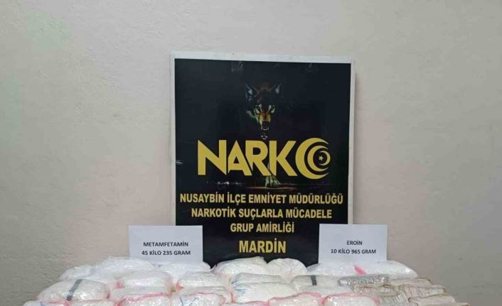 Mardin Valiliğinden yapılan açıklamaya göre, Nusaybin Narkotik Suçlarla Mücadele Büro Amirliği ekiplerince ilçede uyuşturucu madde taşıdığı belirlenen bir araç durdurularak arama yapıldı. Aramada, 45 kilo 235 gram Metanfetamin, 10 kilo 965 gram eroin maddesi olmak üzere toplam 56 kilo 200 gram uyuşturucu ele geçirildi.