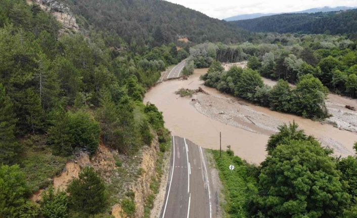 Bolu’nun Mengen ilçesinde derelerin taşması sonucu yaşanan sel felaketinin ardından yıkılan köprüler ve çöken yollar havadan görüntülendi.