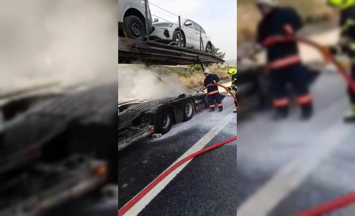 Mersin’in Tarsus ilçesinde otoyolda araç taşıma römorkunda yangın çıktı.