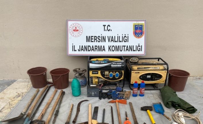 Mersin’in Erdemli ilçesinde jandarma ekipleri, define aramak amacıyla kaçak kazı yapan 2 kişiyi suçüstü yakaladı.