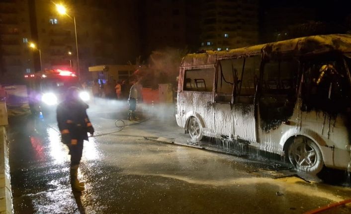 Mersin’in Erdemli ilçesinde sokak arasında park halindeki yolcu minibüsü alev alev yandı. Yangın sonrası minibüs kullanılamaz hale geldi.