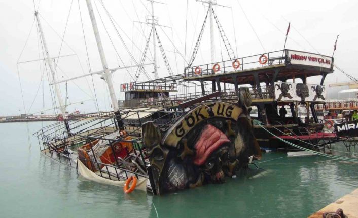 Mersin’in Silifke ilçesinde etkili olan fırtına, balıkçı barınağında bağlı olan bir gezi teknesinin batmasına neden oldu.