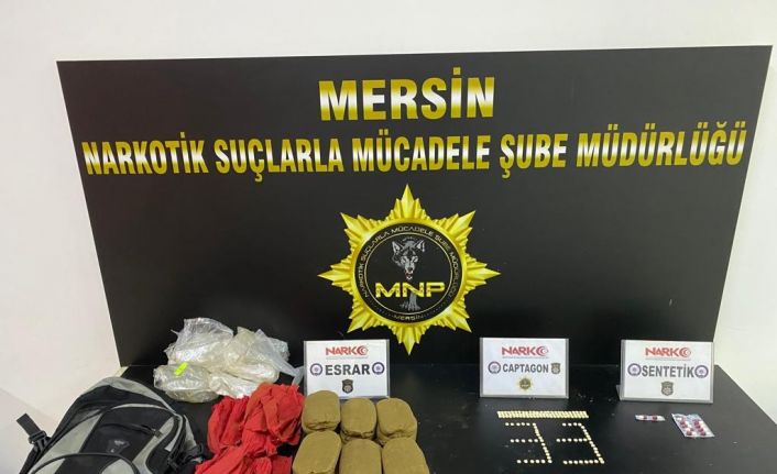 Mersin’de polis ekiplerince yapılan çalışmada, 3 kilo 650 gram esrar ile 400 adet uyuşturucu hap ele geçirilirken, 2 kişi tutuklandı.