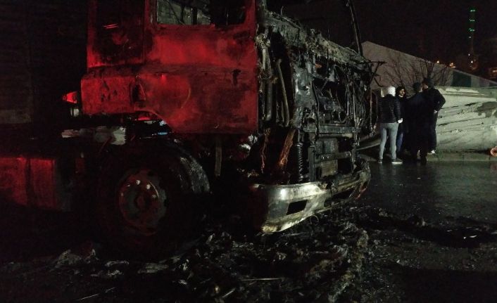 Arnavutköy’de gece saatlerinde metro inşaatına yük taşıyan tır seyir halindeyken cadde ortasında bir anda alev aldı. Yanan tırdan geriye sadece demir yığınları kaldı.