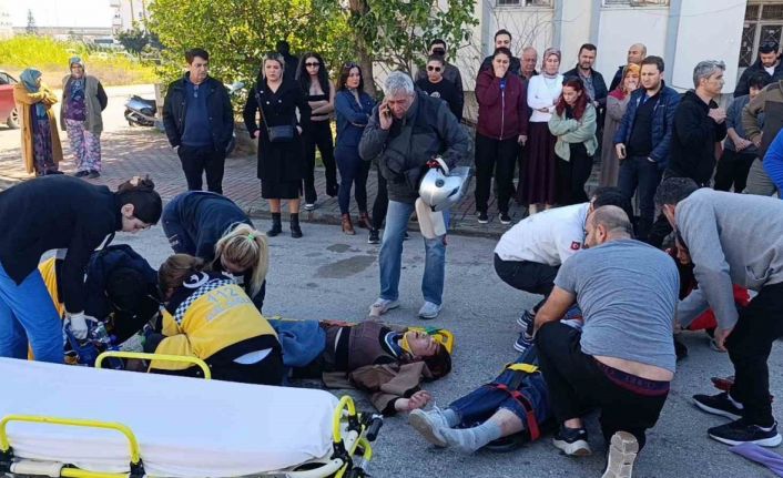 Antalya’da meydana gelen trafik kazasında otomobilin çarptığı motosiklette bulunan 2 genç kız yolun karşı şeridine fırladı. Kazayı duyarak gelen genç kızlardan birisinin babası yerde kanlar içindeki kızını görünce büyük panik yaşarken güçlükle sakinleştirildi.