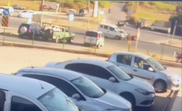 Kaza anı güvenlik kamerasına yansırken, kavşakta bekleyen motosikletin bir anda kırmızı ışık yanarken hafif ticari aracın önüne fırladığı görüldü. Motosiklet ve sürücüsü hafif ticari aracın çarpmasıyla birlikte metrelerce havaya fırlarken, kask sayesinde başını aracın camına çarpmasına rağmen hayata tutundu.