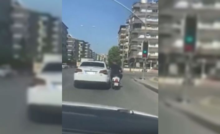 Gaziantep’te bir motosiklet sürücüsü, trafikte seyir halindeki bir başka aracın camına tutunarak metrelerce ilerledi. Motosikletlinin tehlikeli yolculuğu ise başka sürücü tarafından cep telefonu kamerası ile görüntülendi.