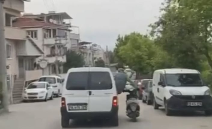 Olay, merkez Osmangazi ilçesi Hürriyet Mahallesi’nde meydana geldi. Edinilen bilgiye göre, seyir halindeki hafif ticari aracın camından sarkan kişi, motosikleti tutarak gideceği yere kadar tehlikeli şekilde götürdü. Trafikteki diğer sürücüler gözlerine inanamazken, o anlar cep telefonu kamerasına yansıdı.