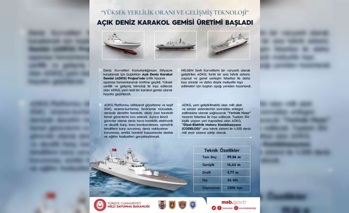Milli Savunma Bakanlığı (MSB), yerli ve gelişmiş teknolojilerle inşa edilecek olan Açık Deniz Karakol Gemisi’nin (ADKG) üretimine geçildiğini duyurdu.