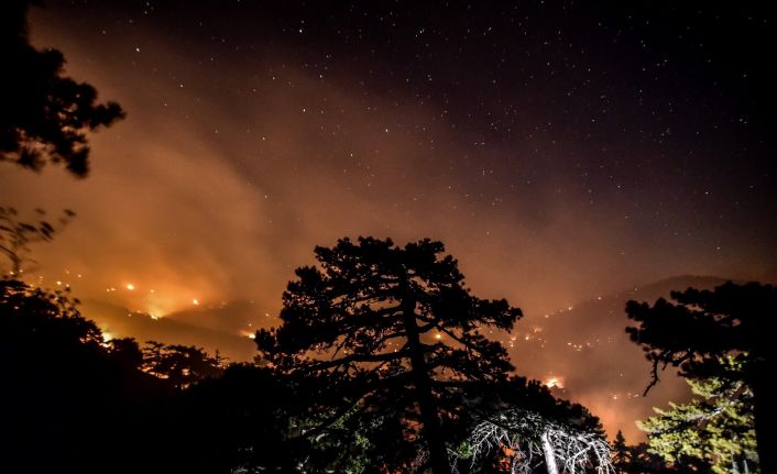 MUĞLA (İHA) – Muğla’da devam eden orman yangınlarında gece boyunca alevlerle mücadele sürdü. Ormandan yükselen alevler ve yıldızlar gökyüzünde birleşti.
