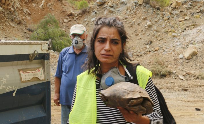 Orman yangının hızla yayıldığı noktada bulunan ormanlık alana gelen ekipler ormanlık alan içerisinde buldukları kaplumbağayı alarak güvenli noktaya taşıdı. Ekipler ormanlık arazide buldukları kaplumbağaya elleriyle su verdi.