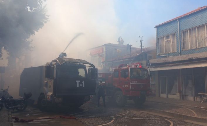 Muğla’nın Ula ilçesinde meydana gelen yangında 13 iş yeri zarar görürken, yangını söndürme çalışmaları havadan ve karadan devam ediyor.