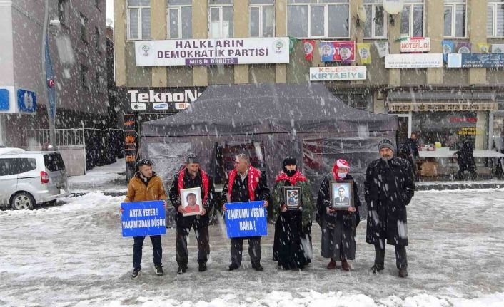 Muş’ta çocuklarının PKK terör örgütü tarafından kandırılarak kaçırılmasından HDP’yi sorumlu tutan aileler, kar altında evlat nöbeti tuttu.