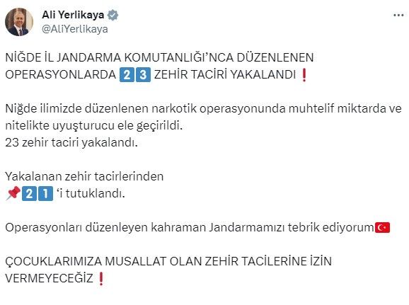 Bakan Yerlikaya, sosyal medya hesabından yaptığı paylaşımda, “Niğde ilimizde düzenlenen narkotik operasyonunda muhtelif miktarda ve nitelikte uyuşturucu ele geçirildi. 23 zehir taciri yakalandı. Yakalanan zehir tacirlerinden 21‘i tutuklandı. Operasyonları düzenleyen kahraman Jandarmamızı tebrik ediyorum” ifadelerine yer verdi.