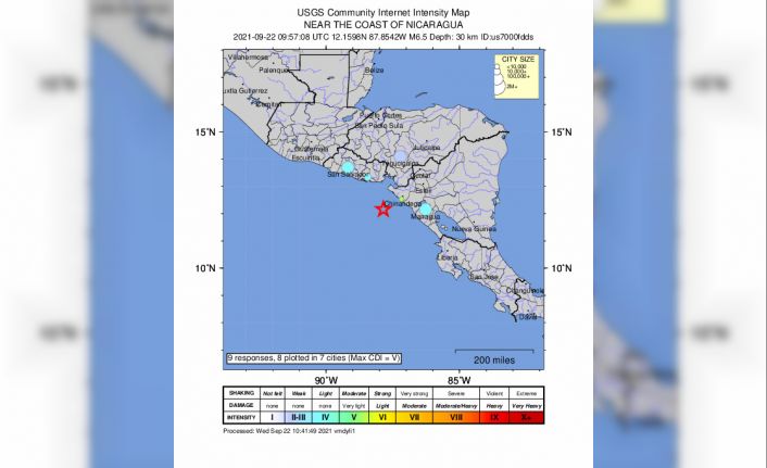 ABD Jeolojik Araştırma Merkezi’nden (USGS) yapılan açıklamaya göre, Nikaragua’nın Jiquilillo kentinin 78 kilometre güneybatısında yerel saatle 09.57’de 6.5 şiddetinde deprem meydana geldi. Yerin 30.74 kilometre derinliğinde meydana gelen depremin ardından tsunami uyarısı yapılmazken, şu ana kadar can veya mal kaybı da bildirilmedi.