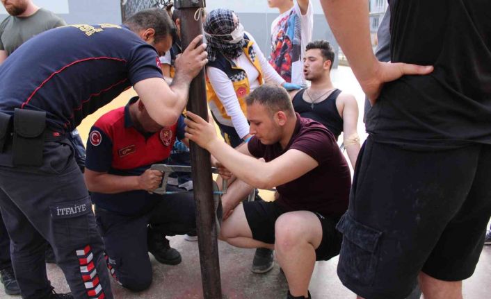 Olay, Efeler ilçesi Kurtuluş Mahallesi’nde bulunan Hacı Lütfiye Atay Ortaokulu’nun bahçesinde meydana geldi. Edinilen bilgiye göre okulun bahçesinde arkadaşları ile oyun oynayan D.B. (20) isimli genç, bir anda sinirlenerek voleybol direğine tekme attı. Tekme, voleybol direğinde filenin gerildiği bölgede bulunan kancanın olduğu bölgeye denk geldi. Bir anda ayağı demire saplanan genç acılar içinde yere yığıldı. Olayı gören vatandaşlar durumu 112 Acil Çağrı Merkezi’ne bildirdi. İhbar üzerine bölgeye polis, itfaiye ve sağlık ekipleri sevk edildi. Kısa sürede bölgeye gelen ekipler, talihsiz genci kurtarmak için demiri kesmeye çalıştı. Sağlık ekipleri tarafında serum bağlanan genç, acılar içinde dakikalarca ayağının kurtarılmasını bekledi. Talihsiz gencin ayağına zarar vermemek için titizlikle çalışan itfaiye ekipleri, yaklaşık 1 saatlik çalışmanın ardından testere ile demiri kesmeyi başardı. Kurtarılan talihsiz genç, ayağına saplanan demir parçası ile birlikte sedyeye alınarak ambulansla ADÜ Araştırma ve Uygulama Hastanesi’ne kaldırıldı. Talihsiz gencin hayati tehlikesinin olmadığı öğrenildi.