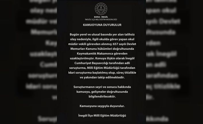 İlçe Milli Eğitim Müdürlüğünden yapılan yazılı açıklamada, "Bugün yerel ve ulusal basında yer alan talihsiz olay nedeniyle ilgili okulda görev yapan okul müdür vekili görevden alınmış; 657 sayılı Devlet Memurları Kanunu hükümleri doğrultusunda kaymakamlık makamınca görevden uzaklaştırılmıştır. Konuya ilişkin olarak İnegöl Cumhuriyet Başsavcılığı tarafından adli soruşturma, Milli Eğitim Müdürlüğü tarafından idari soruşturma başlatılmış olup, süreç titizlikle ve yakından takip edilmektedir. Soruşturmanın seyri ve sonucu hakkında kamuoyu, gelişmeler doğrultusunda bilgilendirilecektir" denildi.
