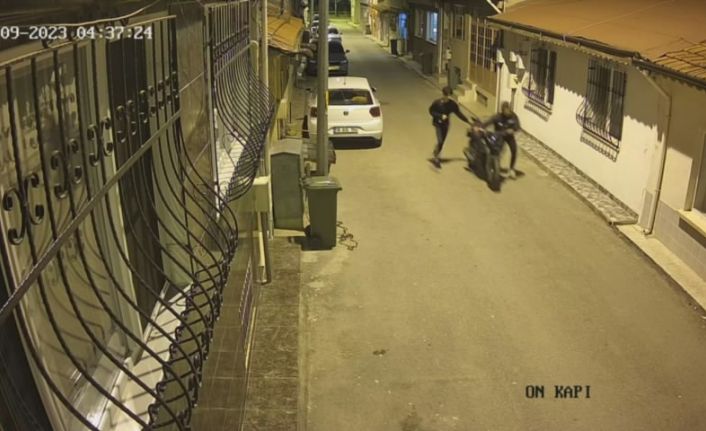 Bursa’nın Osmangazi ilçesinde 2 hırsız önce keşif yaptılar sonrasında motoru çalıp kayıplara karıştılar. Olay güvenlik kamerasına yansıdı.