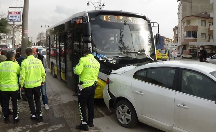 Bursa’nın İnegöl İlçesinde meydana gelen kazada önünde seyir halinde olan otomobile arkasında gelen halk otobüsü çarptı. Kazada otomobil sürücü hafif şekilde yaralanırken kaza anı bir işyerinin güvenlik kamerasına yansıdı.