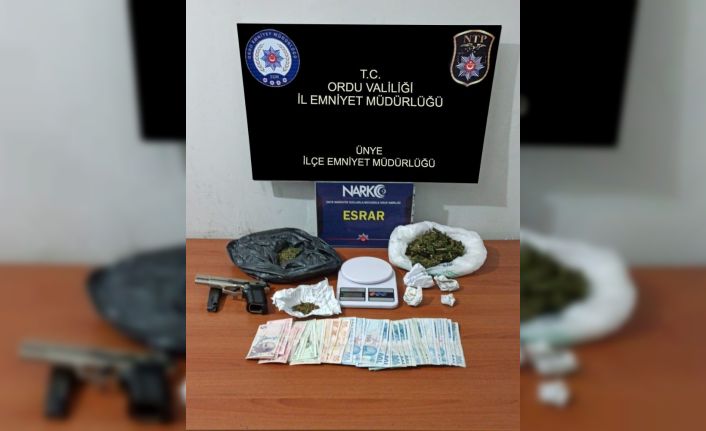 Edinilen bilgiye göre, alınan bir ihbarı değerlendiren Ordu İl Emniyet Müdürlüğü’ne bağlı Ünye Narkotik Suçlarla Mücadele Grup Amirliği ekipleri, uyuşturucu sattığı belirlenen M.C.Ç. isimli şahsı takibe aldı. Saraçlı Mahallesi’nde görülen şüpheli, kovalama sonrası ekipler tarafından yakalandı. Yakalanan şahsın ifadesi sonucu ekipler, H.S. isimli şahsı da ikametinde gözaltına aldı. Her iki şüphelinin ev ve üst aramasında ise bir ruhsatsız tabanca, 155 gram kubar esrar, hassas terazi ile 2 bin 750 lira para ele geçirildi.
