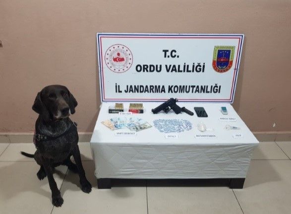 Ordu İl Jandarma Komutanlığınca uyuşturucu madde ile mücadele kapsamında yapılan çalışmalar neticesinde, 2 şüpheli şahsın üstleri ile aracında, ev ve eklentilerinde yapılan aramalarda 300 adet ecstacy hap, 30 gram metamfetamin, 25 gram toz esrar, 1 adet ruhsatsız tabanca, 74 adet tabanca fişeği, 1 adet sahte 100 dolar, 4 adet sahte 100 TL 1 adet sahte 50 TL, 1 adet hassas terazi, 1 adet metamfetamin uyuşturucu kullanma aparatı ele geçirildi.