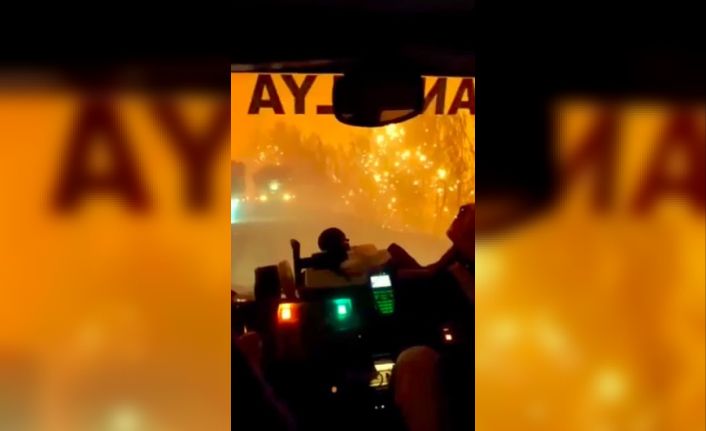 Antalya’nın başta Manavgat olmak üzere Akseki ve Gündoğmuş ilçelerinde 10 gündür devam eden yangın, dün itibariyle tamamen kontrol altına alınırken, geçtiğimiz Cuma gecesi söndürme ekiplerinin arazözle alevlerin arasında kaldığı görüntüler ortaya çıktı. Orman işletme müdürlüğüne bağlı ekiplerin etrafını bir anda saran alevler, arazöz içindeki ormancıların soğukkanlılığı ve telsizle yönlendirilmeleri sayesinde faciaya neden olmadı. Yaşananların cep telefonuyla kaydedildiği anlarda, arazözde bulunan ekibin yaklaşık 100 metre ilerisindeki başka bir arazöz, etrafı saran ateş çemberi ve telsizle yönlendirilmeleri kayda girdi. Telsizden yapılan ’Panik yapmayın, yavaş yavaş geri gidin’ anonslarıyla bölgeden ayrılan arazöz, merkez ekiplerinin yönlendirmesi ve soğukkanlılık sayesinde faciadan kıl payı döndü.Orman ekiplerinin alevlerin arasında ölümle burun buruna geldiği anlar