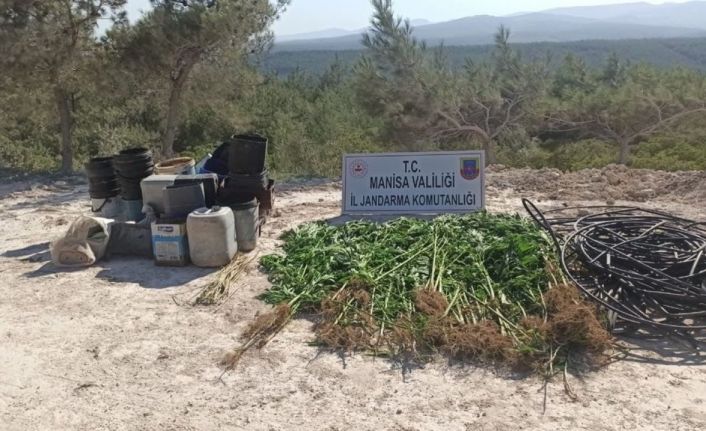 Manisa’nın Saruhanlı ilçesinde ormanlık alanda saksılar içinde 380 kök kenevir bitkisi yetiştiren şahıs, kenevirleri sularken jandarma tarafından suçüstü yakalandı.