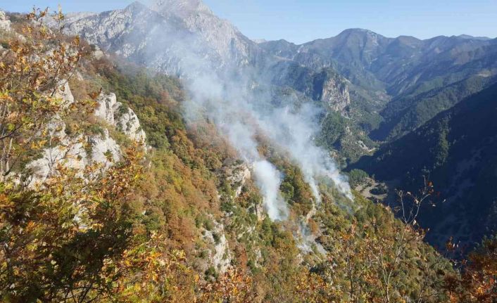 Bugün ise aynı noktada yeniden yangın çıktı. Arazinin sarp olmasından dolayı karadan müdahale edilemezken havadan 2 helikopter ile müdahale sürüyor.