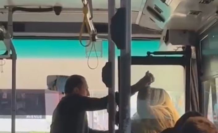 Otobüs içerisindeki yolcuların araya girmesiyle kavga güçlükle sonlandırılırken, yaşanan o anlar cep telefonu kamerasıyla kaydedildi.