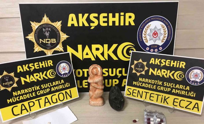 Konya’nın Akşehir ilçesinde polis ekiplerinin ihbar üzerine otobüsle seyahat eden bir yolcunun üzerinde yaptıkları aramada uyuşturucu hap ve heykel ele geçirildi.
