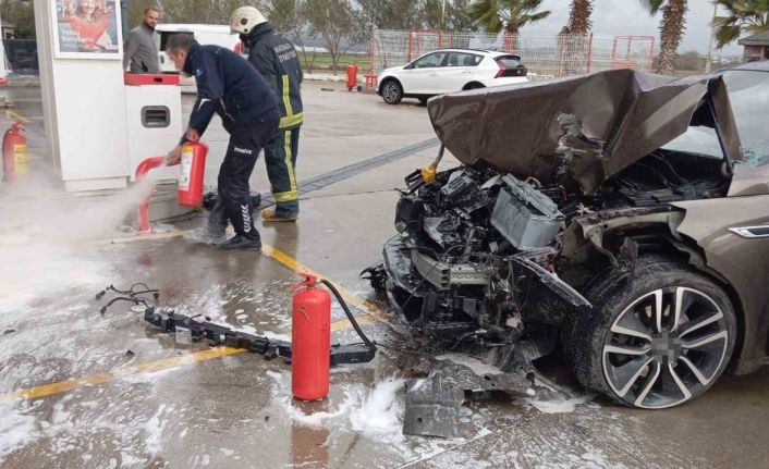 Otomobil akaryakıt istasyonuna daldı, facianın eşiğinden dönüldü