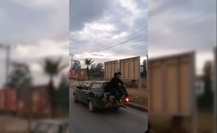 Antalya’da seyir halindeki otomobilin kazalı olan bagaj kısmına oturup, canını hiçe sayan gencin tehlikeli yolculuğu trafikteki diğer araçların kamerasına takılırken, gencin yolculuk sırasındaki telefon tutkusu da pes dedirtti.