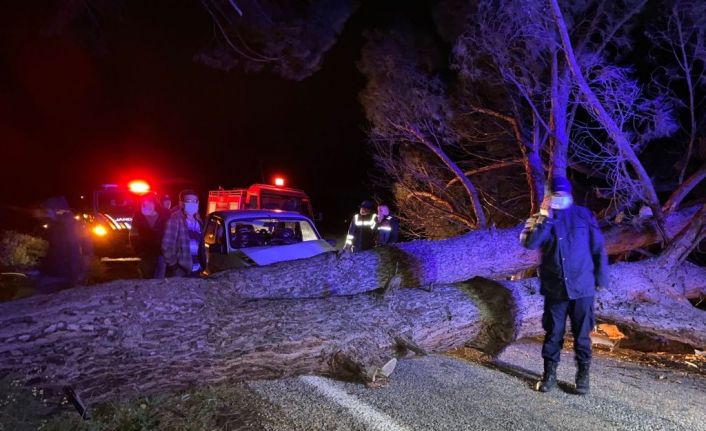 Manisa’nın Gördes ilçesinde seyir halindeki otomobil şiddetli rüzgar sebebiyle devrilen çam ağacına çarptı. Kazada 3 kişi yaralandı.