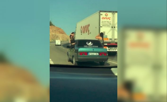 Antalya’da trafiğin yoğun olduğu çevre yolunda aracın arka pencerelerinden sarkarak hem kendi canlarını hiçe sayan hem de diğer sürücülerin dikkatini dağıtarak kazaya davetiye çıkaran iki kadın görenlere pes dedirtti.