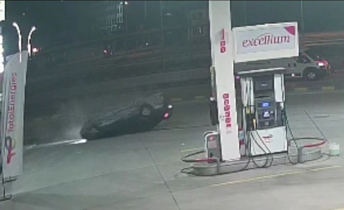 Karabük’te bir otomobilin akaryakıt istasyonuna girmeye çalıştığı sırada önce otomobile sonra kaldırıma çarparak ters döndüğü anlar güvenlik kamerasına yansıdı.