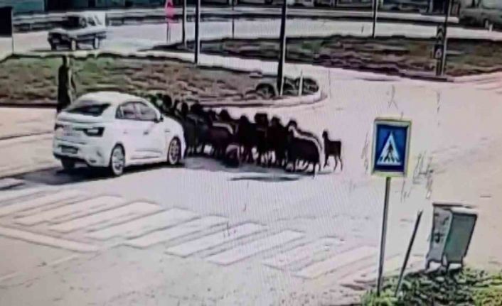 Hatay’da kavşaktan geçmek isteyen koyun sürüsünün arasına dalan otomobilin o anları kameraya yansıdı. Kazada 5 küçükbaş hayvan telef oldu.