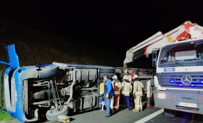 Kuzey Marmara Otoyolu’nda gece saatlerinde meydana gelen kazada TIR sürücüsü devrilen dorsenin altında kalarak feci şekilde can verdi. Henüz bilinmeyen bir nedenden dolayı direksiyon hakimiyetini kaybeden hurda yüklü TIR otoyolun kenarında bulunan su kanalına düşerek yan yattı. Kaza esnasında TIR’ın çekici kabininden fırlayan sürücü devrilen dorsenin altında kalarak can verdi.