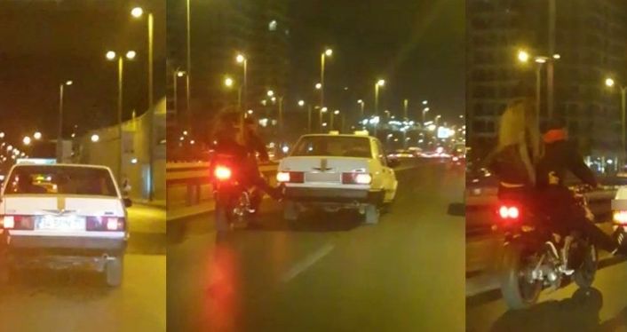 E-5 karayolu Yenibosna mevkisi yan yol Edirne istikametinde seyreden sürücüler bir motosikletlinin otomobilin tamponuna ayağını uzattığını gördü. Motosikletli genç, arkasındaki genç kız rağmen dakikalarca bu şekilde seyretti. Otomobili dakikalarca bu şekilde iten genç motosikilet sürücüsü, görüntülendiklerini farkına varınca bir süre sonra ayağını indirdi. Yaşanan tehlikeli yolculuk ise cep telefonu kamerasına yansıdı.