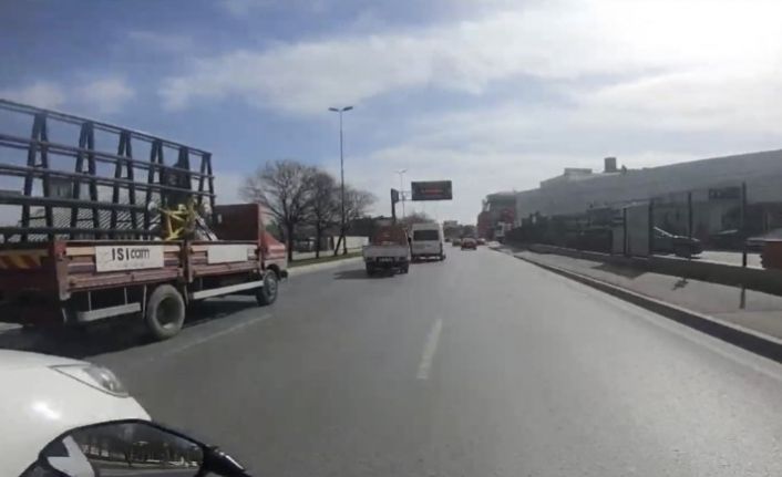 Avcılar Polis Merkezi Amirliği yakınlarında kamyonetle “makas” atarak ilerleyen bir maganda, cadde üzerinde otomobille seyreden kadının önüne kırdı. Kazadan sonra kamyonetteki magandalar ters istikamete doğru kaçtı. Neye uğradığını şaşıran kadın, magandaların peşinden koşarken, bir yandan da telefonla polisi aradı. Yaşananlar kask kamerasına yansıdı.