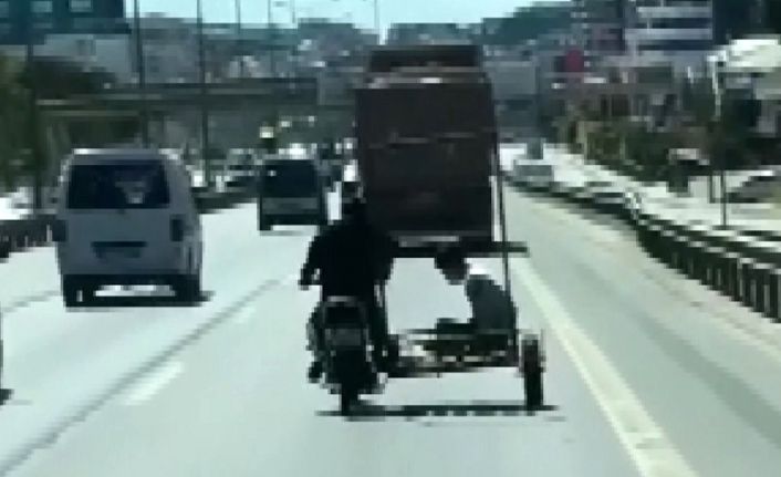 Kartal’da sepetli motosiklet sürücüsü ve yanında taşıdığı kişinin tehlikeli yolculuğu yürekleri ağızlara getirdi. Trafikteki araç sürücülerinin korna çalarak tepki gösterdiği o anlar vatandaşın cep telefonu kamerasına yansıdı.