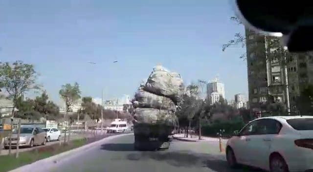 Ümraniye’de kasasında metrelerce yükseklikte çuvallar bulunan kamyon görenleri şaşkına çevirdi. Kamyonun kasasından sarkan içi dolu çuvalların şans eseri yola devrilmemesi olası bir faciayı önledi. Kasasında metrelerce yükseklikteki çuvallarla ilerleyen kamyon vatandaşın cep telefonu kamerasına yansıdı.